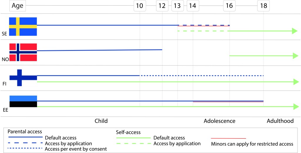 We found that Sweden and Norway appeared to be different from Finland and Estonia. Age limits for parental loss of access were lower in Sweden (age 13) and Norway (age 12), than in Finland and Estonia (age 18). In Sweden, parents and adolescents were able to apply for access outside of regulation. The age of obtaining EHR self-access was the same in Sweden and Norway (age 16) while by contrast in Finland and Estonia, there was no lower age for when the minor obtained access to their EHR. None of the studied countries exempted any potentially sensitive health information by default from parent access.