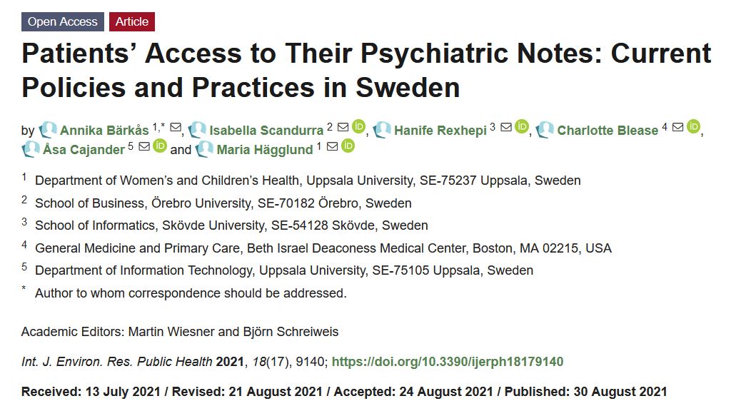Swedish partners recently published an article on the subject of patient’s access to their psychiatric notes. Here is a brief summary. The phenomenon of sharing clinical notes or narrative visit reports with patients is often referred to as ‘open notes.’ Open notes in psychiatric care are considered particularly controversial. The few studies that have investigatedContinue reading “Patients’ Access to Their Psychiatric Notes”