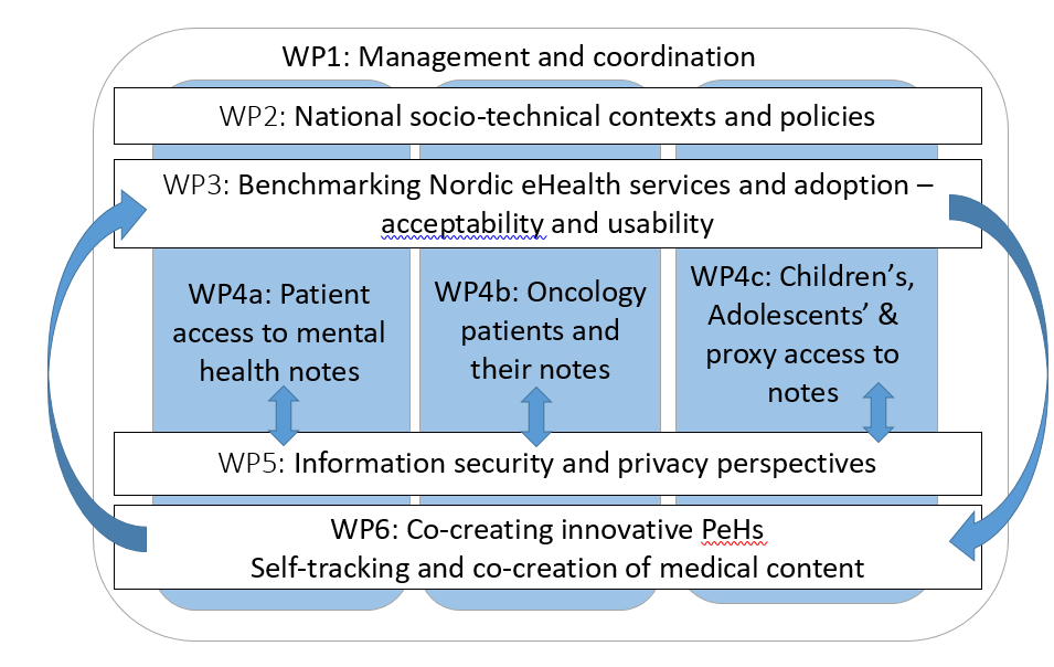 The consortium activities are divided into 6 work packages. The work packages are connected and continuous collaboration between them will be essential. WP2 provides the foundation of the other work packages. WP3 will iteratively inform WP6 with tools and measures for evaluating PeHS, and in turn receive results of testing the tools on novel PeHS resulting from the co-design in WP6. Building on the results from WP2, WP4 (a-c) will further explore the needs of specific patient or demographic groups using the current implementations of PAEHRs as a case. WP4 will closely collaborate with WP5, with results on patients and family caregivers views, knowledge and stewarding of their own health data from a privacy and information security perspective.